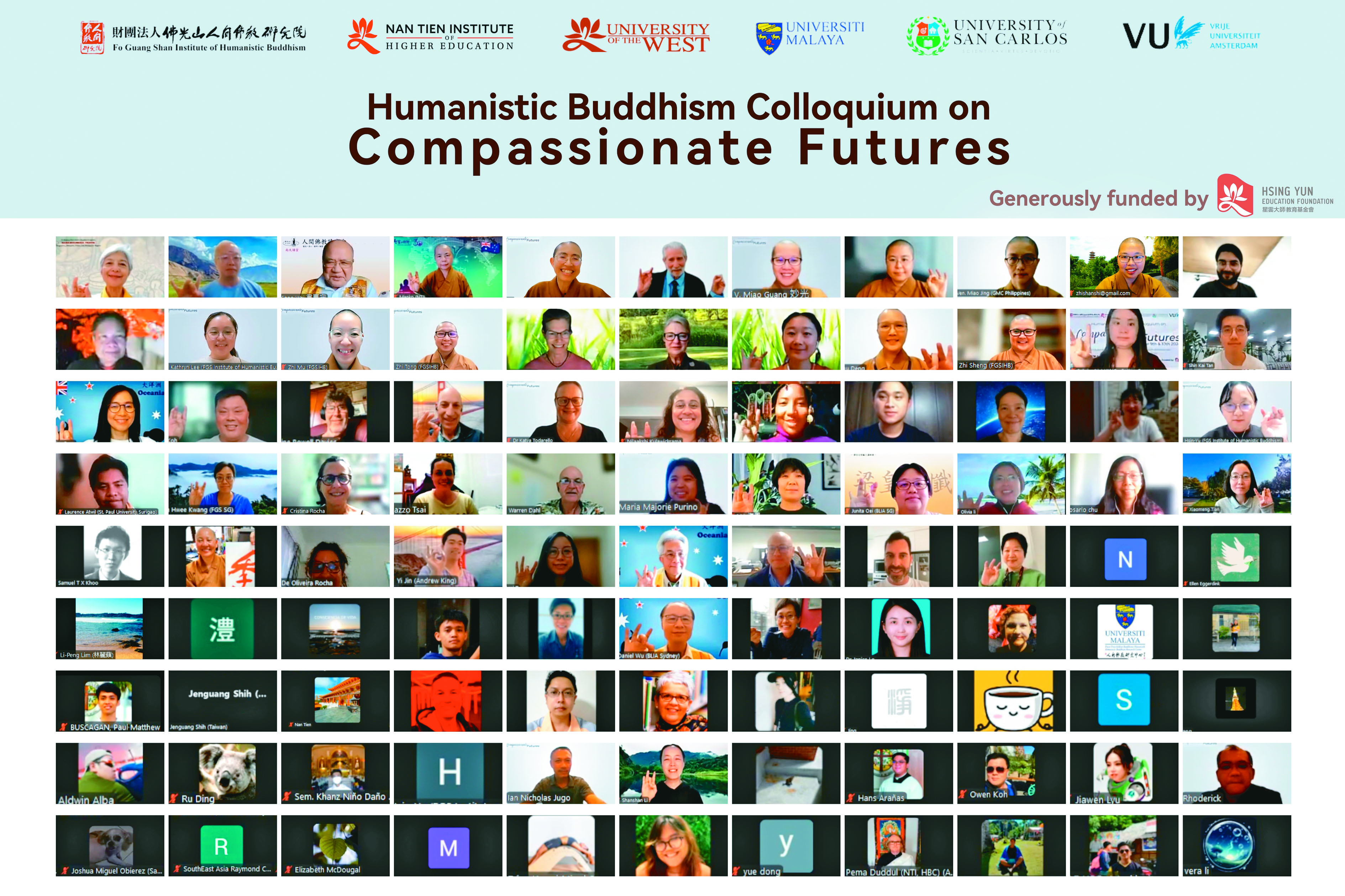 来自佛光山、美国佛光山西来大学、澳洲佛光山南天大学、马来亚大学、圣卡洛斯大学及阿姆斯特丹自由大学的学者与专业人士参与此次会议,与会者横跨全球时区,实现二十四小时不间断的论坛接力。通过联机交互和对话,来自不同文化后台的与会者共同探讨如何以宗教智慧应对现代社会的诸多挑战,并分享人间佛教的实践方案,以求在全球范畴内播下慈悲的种子。