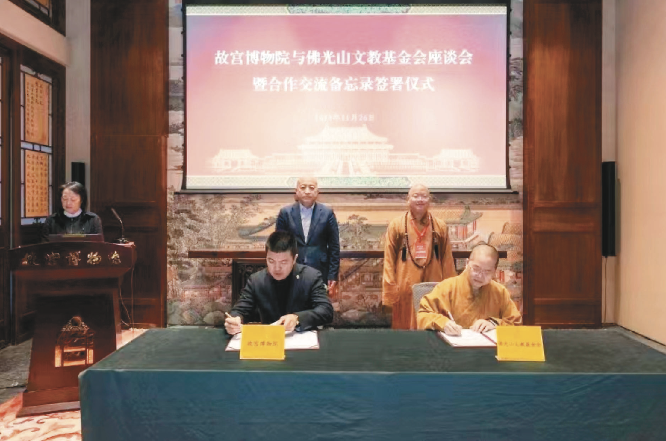 【人间社记者心立北京报导】北京故宫博物院与佛光山文教基金会12月26日于北京故宫签署合作交流备忘录,由佛光山住持心保和尚与故宫博物院院长王旭东担任见证人,佛光山文教基金会执行长如常法师与北京故宫常务副院长娄玮代表签署。双方并于现场进行座谈,就未来可进行的项目提出看法。