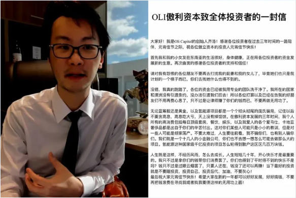这家公司叫傲利资本,创始人名为齐洛,信的内容足以让人“三观震碎”,跟去年底同样官宣跑路的湖南盛大金禧如出一辙:钱早就洗干净了,我们人都到国外了,所在国家没有引渡条约,这是给你们投资人的一个教训,不经历风雨怎么成长……