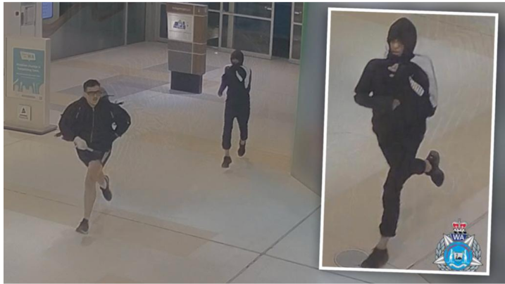 一名男子拿着某种杆子和一个大背包,用护目镜遮住脸,一边慢跑一边试图拉上他背着的背包的拉链。而另一名男子则系好连帽衫,遮住头跟在后面。两人随后徒步逃离了Jull Street中心,并继续逃避警方的追捕。