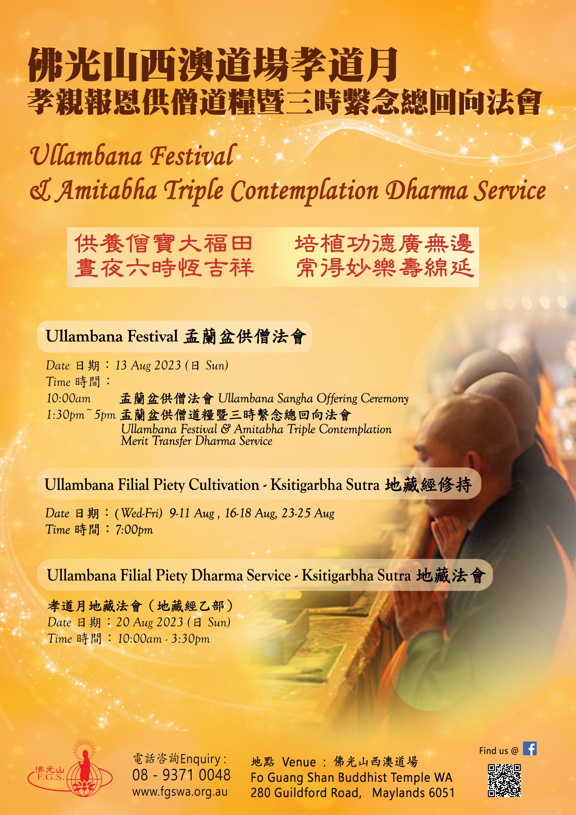 佛光山全體大眾,為感謝諸位檀信捐獻道糧長期供養僧眾,特於813(星期日)10am舉行「盂蘭盆供僧法會」,於1:30pm啟建「盂蘭盆孝親報恩供僧道糧暨三時繫念總回向法會」,並宣讀文疏,所有功德迴向各位護法信徒之現生父母延年益壽,過往先靈上生佛國,屆時歡迎閤府回山拈香,共霑法益。